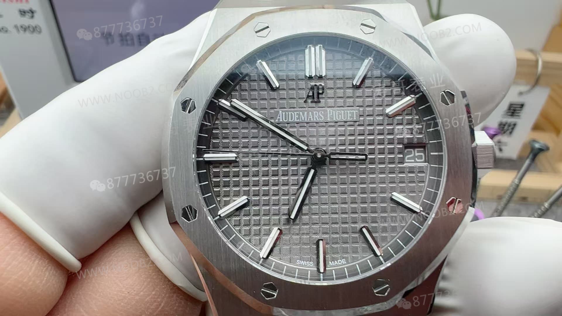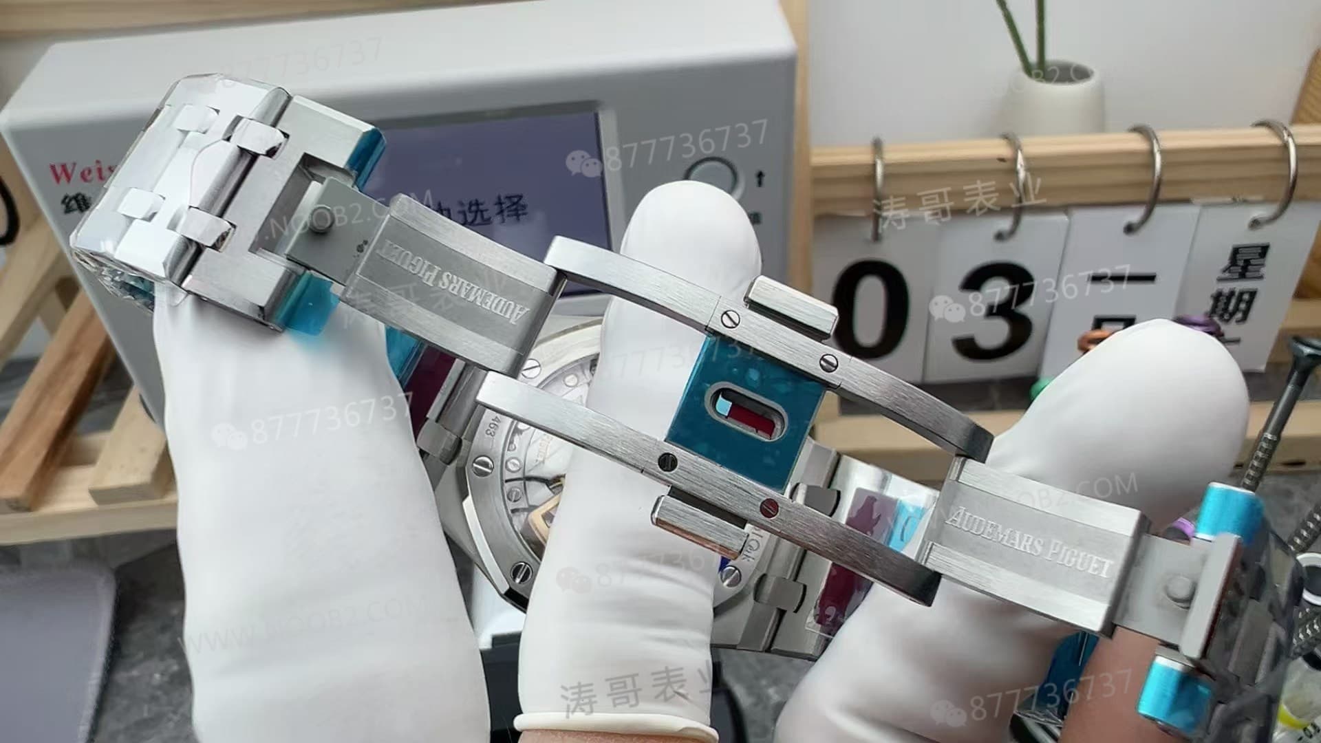 目前15500也有很多厂在做,其他厂的话它这个地方它是做粗的,它没有说做的这么的细。然后VS的话它这里是做细的,就是比较对的,和APS是做的一样的。然后日历它的日历的话就比APS做的要更加的好的,因为它的日历的颜色它是比较偏黄色一点点的,就白黄色。然后APS的话它这个质地会比较偏白色一些,就白灰的感觉。